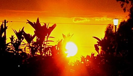 真っ黒な雨雲の間からの夕焼けが真っ赤でした。